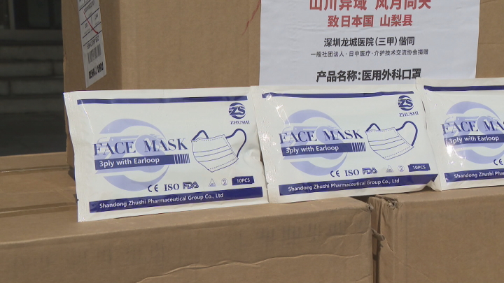 新型コロナウイルスの感染拡大防止に役立ててもらおうと中国の民間病院から山梨県に10万枚の医療用マスクが贈られました。
