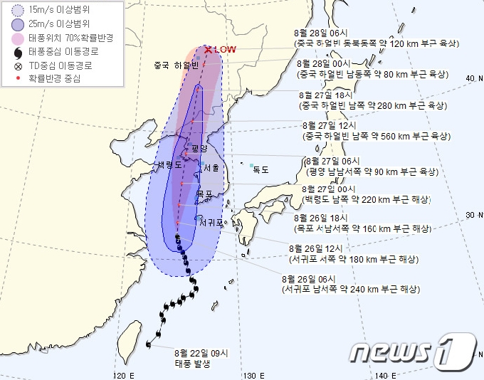 | 26일 오전 7시 기준 제8호 태풍 '바비(BAVI)' 예상 진로도.(기상청 제공)© News1 |