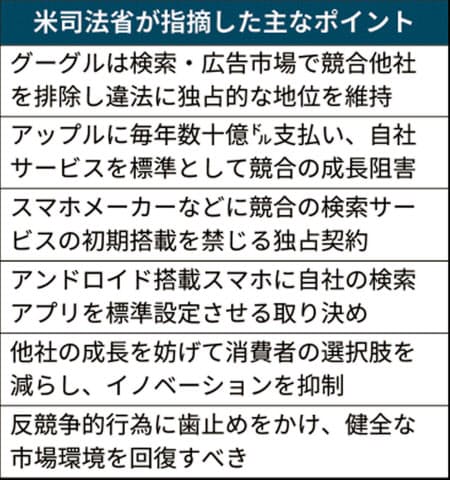 具体的には米国のスマホ市場で約6割のシェアを握るアップルに年間最大120億ドル(約1兆3000億円)を支払い、グーグルのインターネット検索サービスを標準としていることが反競争的と指摘した。アップルの幹部社員がグーグル社員に宛てた「両社があたかも一体であるかのように考えている」などと記した文書などを不適切な行為の証拠として挙げた。