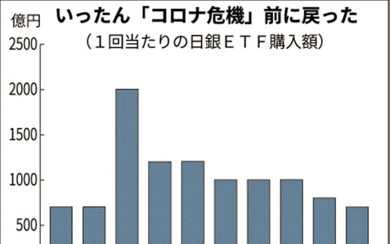 「上場投資信託(ETF)の積極的な買い入れにより、企業等の資金繰り支援と金融市場の安定維持に努めていく」――。日銀は29日、公表した経済・物価情勢の展望(展望リポート)に改めてそう明記した。金融政策決定会合でETFの年間購入額(上限12兆円)を維持することも決めた。もっとも実際にはETF購入額をかなり減らしてきている。10月に入ると、1回当たりの買い入れ額を新型コロナウイルスの悪影響が本格化する…