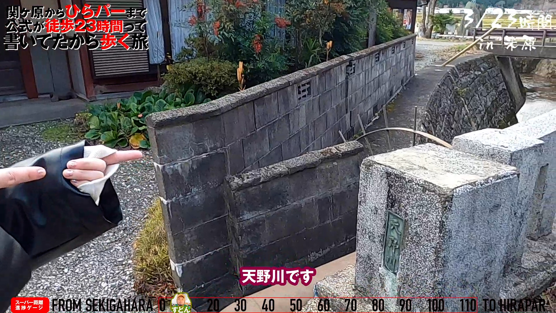 スタートから3時間が経過し、引き続き歩いていると、滋賀県の天野川をお白の方が発見。