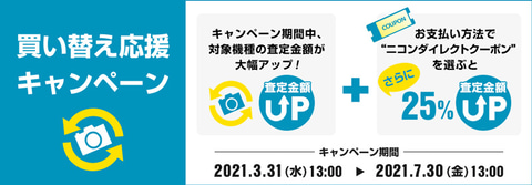 手持ちの製品の買取代金を使って新しい商品を購入できるサービス。キャンペーン期間中は対象機種の査定金額がアップするほか、買取代金を現金ではなくニコンダイレクトクーポンで受け取る場合、さらに査定金額が25%アップするという。