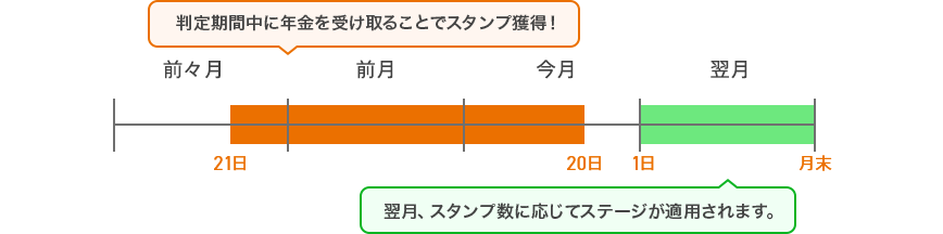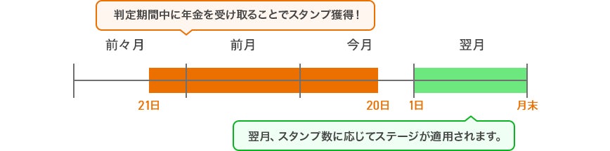 | 前々月21日~今月20日の間にauじぶん銀行で年金を受け取るとスタンプが獲得できます。 獲得したスタンプは、翌月のステージに適用されます。 |