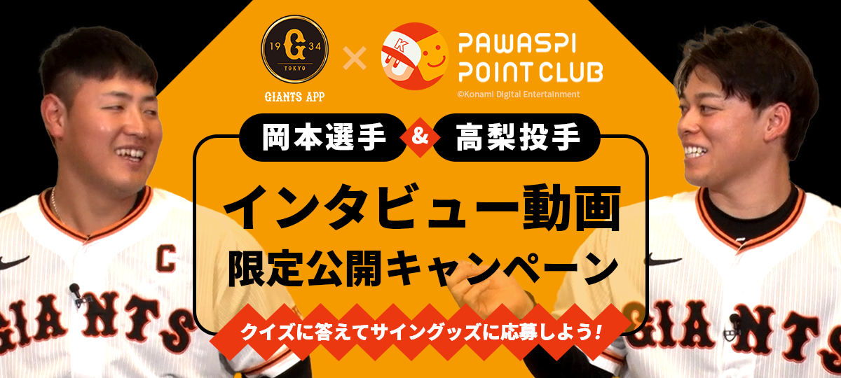 インタビュー動画視聴方法: ①「GIANTS APP」をダウンロードし、アプリ内右上のボタンからGIANTS IDを使ってログイン ②「GIANTS APP」トップ画面下部の「Experience」を選択し、「インタビュー動画 限定公開キャンペーン」バナーをタップ ③キャンペーンページ内の「②KONAMI IDにログイン」をタップ。KONAMI IDを使ってログイン。 プレゼント応募方法: ①「GIANTS APP」の「インタビュー動画 限定公開キャンペーン」ページ内でインタビュー動画を視聴後、設問に回答する ②「注意事項に同意する」をタップし、記載内容を了承したらチェックボックスをタップ ③「キャンペーンに応募する」をタップする 実施期間:5月2日(火)午後5時~5月17日(水)正午 対象者:GIANTS IDとKONAMI IDを取得の方 プレゼント商品:①岡本選手&高梨投手直筆サイン入り調子くんぬいぐるみ(4名) ②岡本選手&高梨投手直筆サイン入り色紙(2名) ※当選発表は、マイページのご登録住所への発送をもってかえさせていただきます。 ※抽選グッズの種類指定はできません。 <注意事項> ・キャンペーンへの参加は1人1回です。 ・特典を受け取る権利を第三者に転売・譲渡することはできません。また、第三者になりすまして特典を受け取ることもできません。万が一、当該行為が確認された場合、特典の付与を無効とし、両社の会員規約に則ってサービス提供の停止ならびに退会処分とする場合があります。