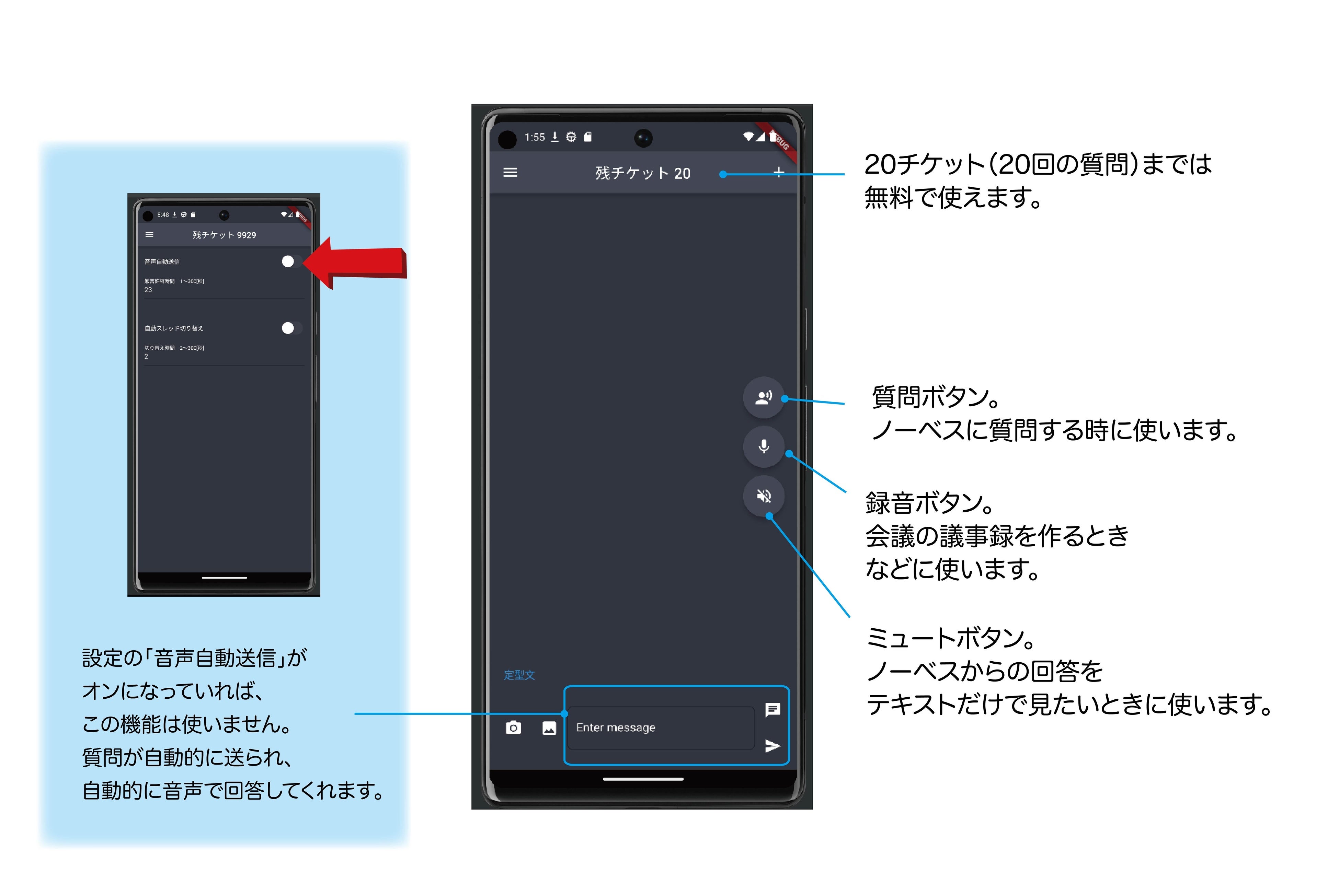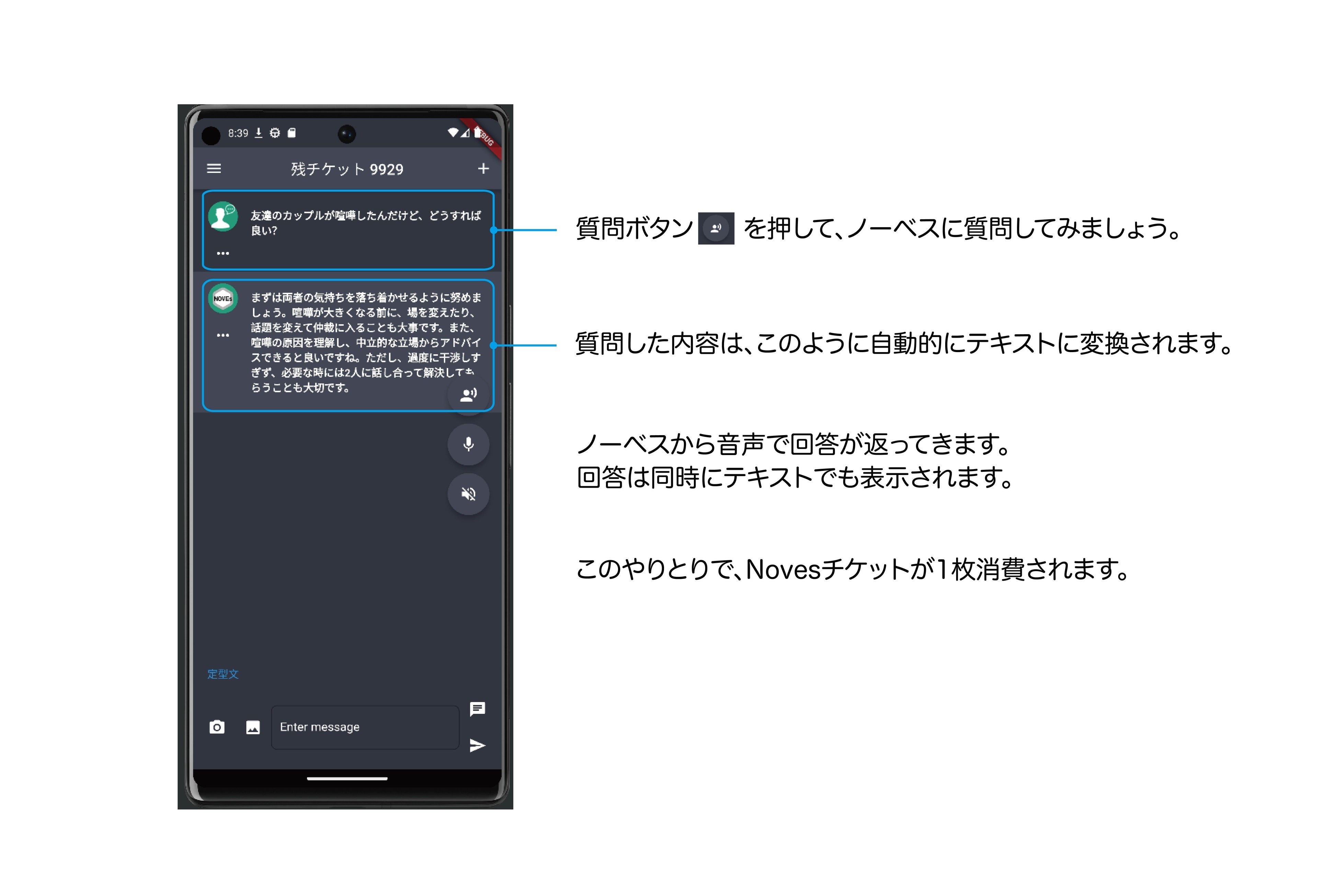 アプリDL後、20回の通常チャット(音声で質問を投げかけて、音声で回答)が行える20枚のNovesチケットが発行されます。